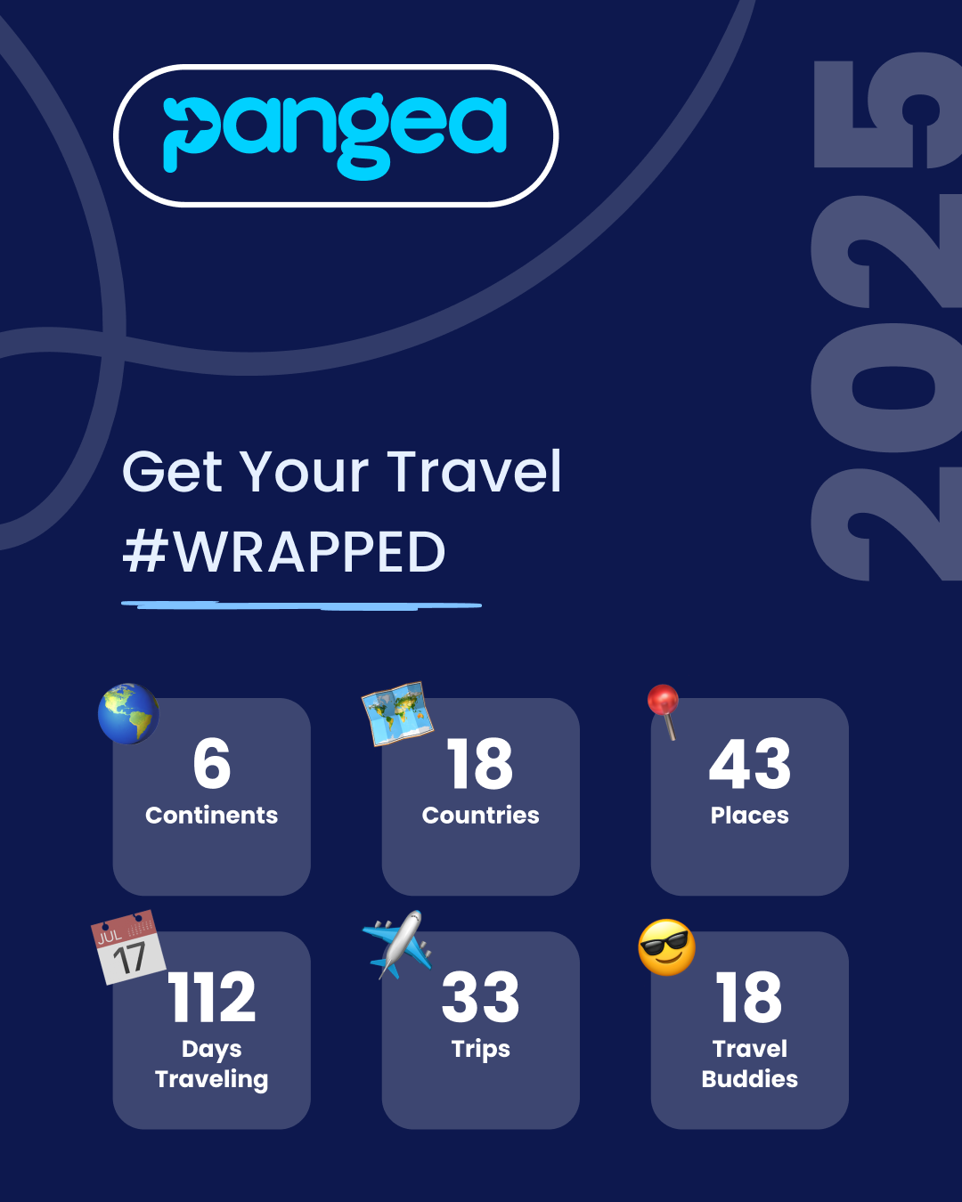 Pangea #Wrapped is a yearly travel recap that turns your trips into beautiful, shareable travel infographics, similar to Spotify Wrapped but focused on where you have been and who you traveled with.