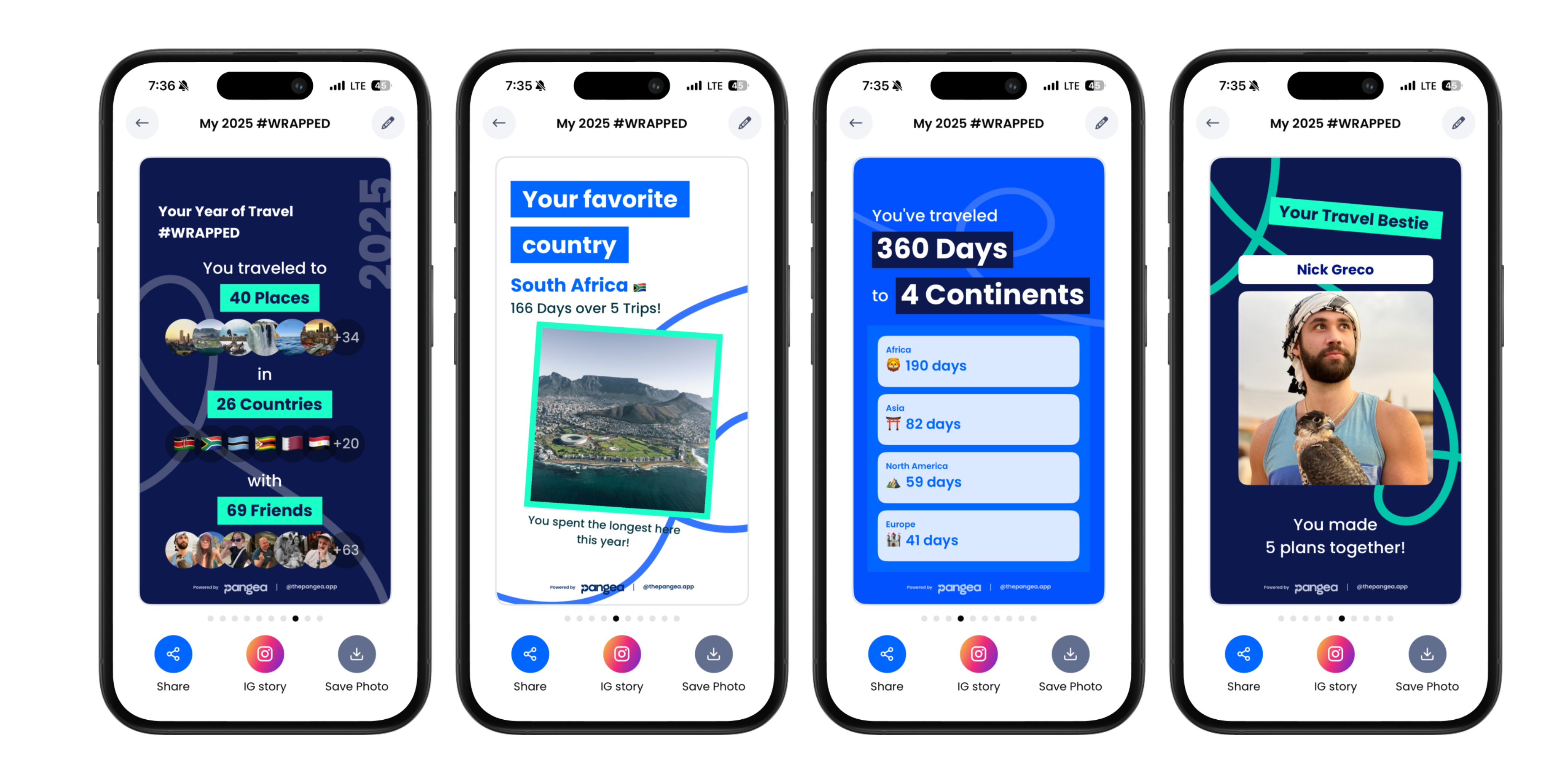 Today, Pangea #Wrapped represents the pinnacle of our travel #Wrapped experience. With regeneration for new trips and companions, Instagram-ready infographics, and a social-first design, it continues to help travelers share travel memories on Instagram and celebrate a year well traveled.